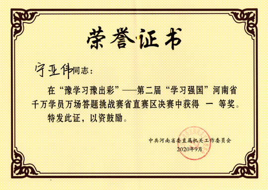 9月9日上午,省委直屬機關(guān)工委舉辦的"豫學(xué)習豫出彩"--第二屆"學(xué)習強國"河南省千萬(wàn)學(xué)員萬(wàn)場(chǎng)答題挑戰賽省直賽區決賽舉行,94名省直和中央駐豫單位"學(xué)習達人"現場(chǎng)展開(kāi)"知識對決"。公司環(huán)境院青年黨員寧亞偉代表黃委參賽,以通關(guān)成績(jì)榮獲一等獎。
