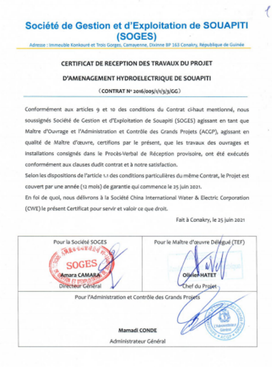 "七一"前夕,國際項目傳來(lái)佳訊。當地時(shí)間6月25日,幾內亞蘇阿皮蒂水電站項目收到了業(yè)主頒發(fā)的接收證書(shū),項目順利通過(guò)驗收。